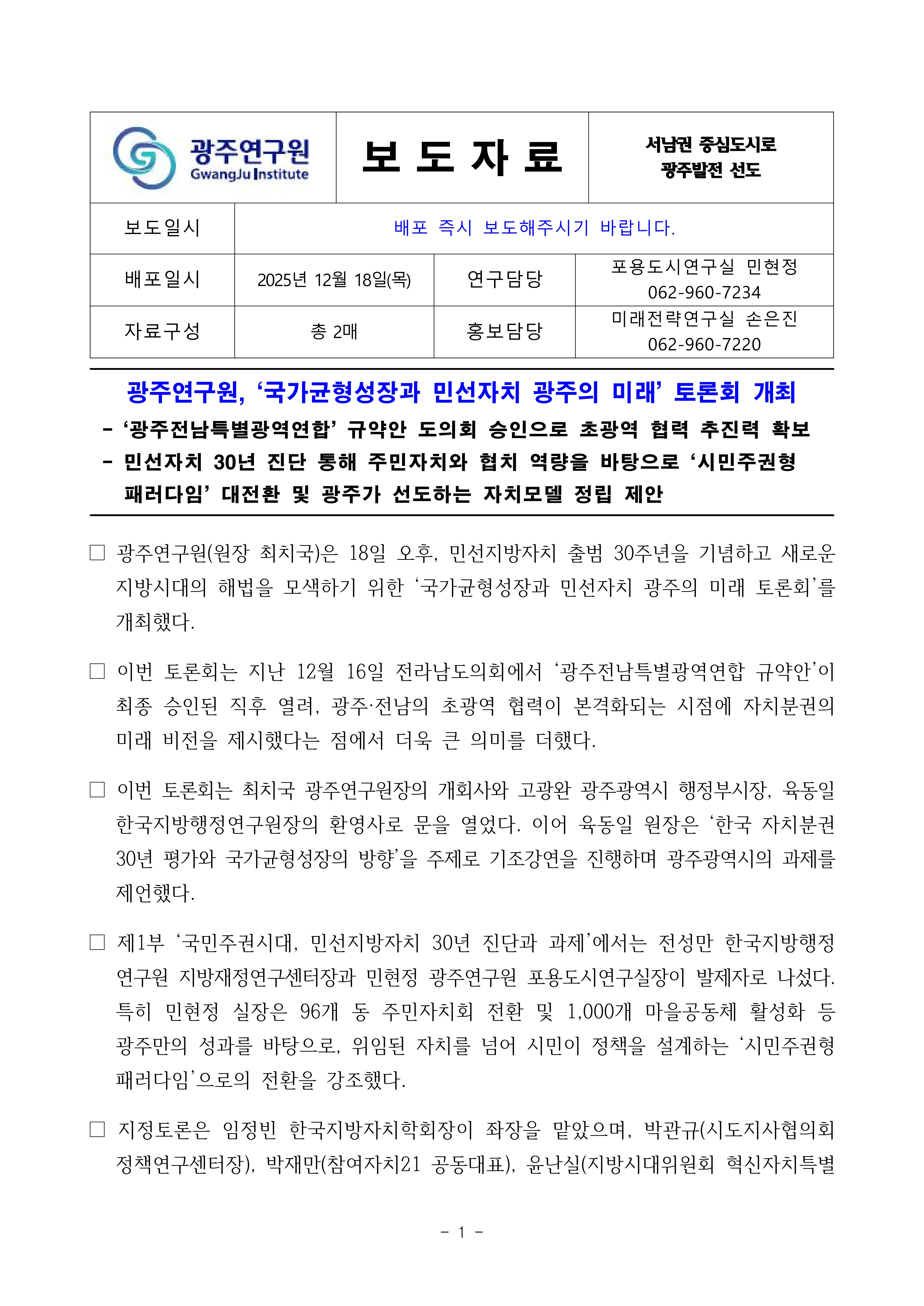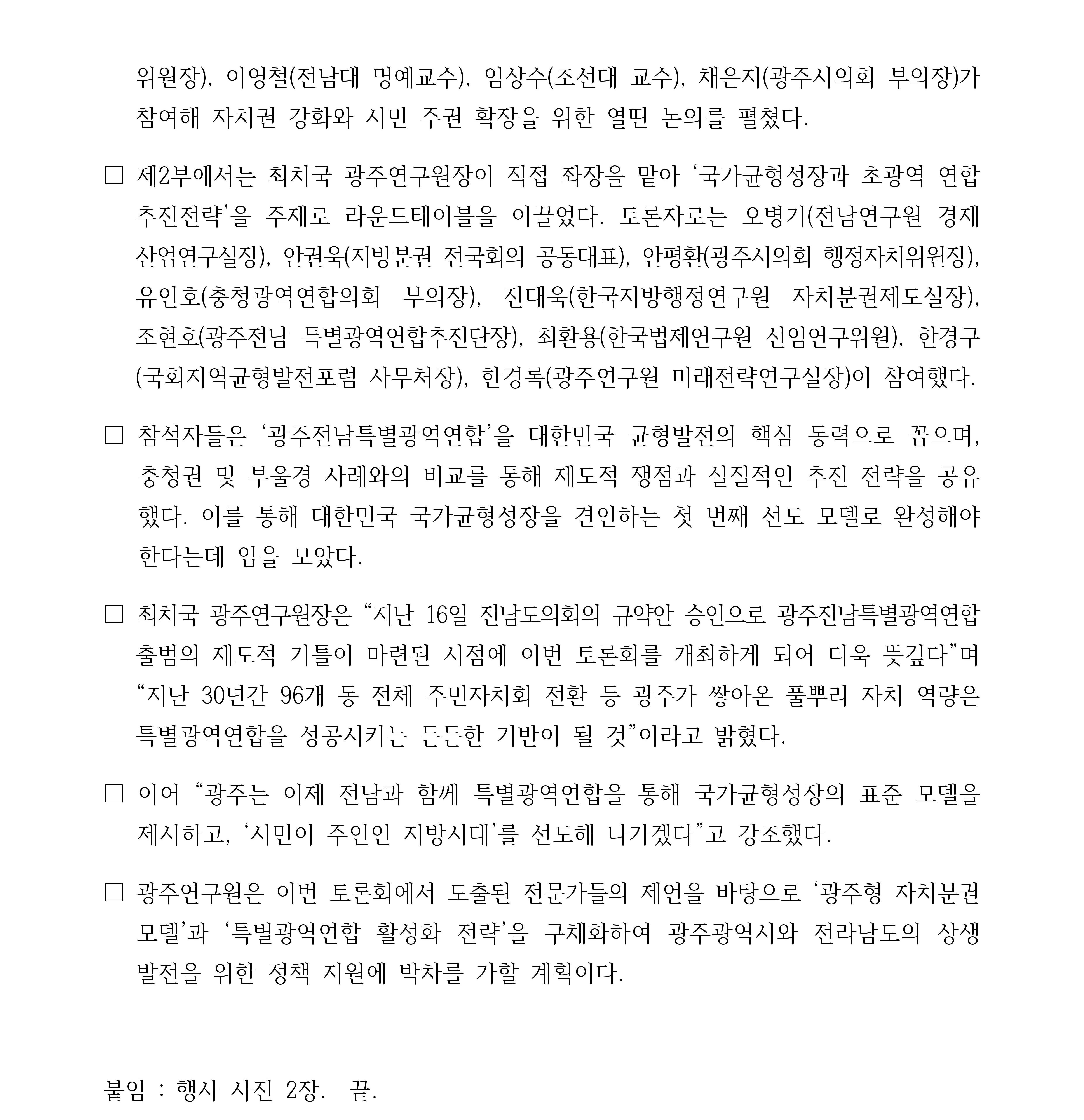 광주연구원, ‘국가균형성장과 민선자치 광주의 미래’ 토론회 개최