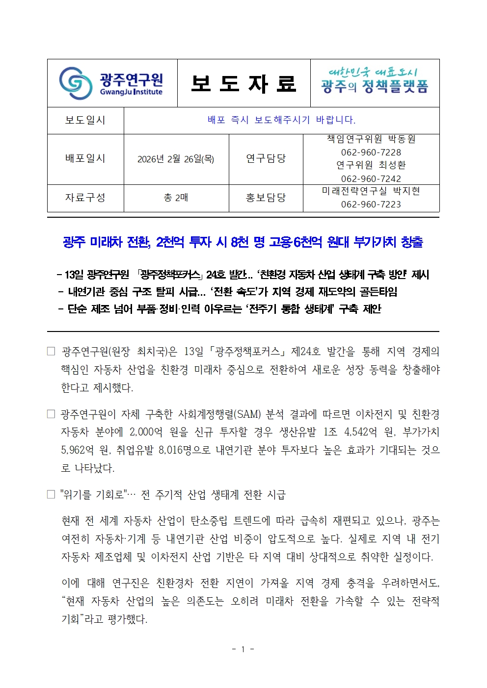 파일 #2 : [광주연구원 보도자료] 광주 미래차 전환, 2천억 투자 시 8천명 고용·6천억 원대 부가가치 창출(광주정책포커스).hwp