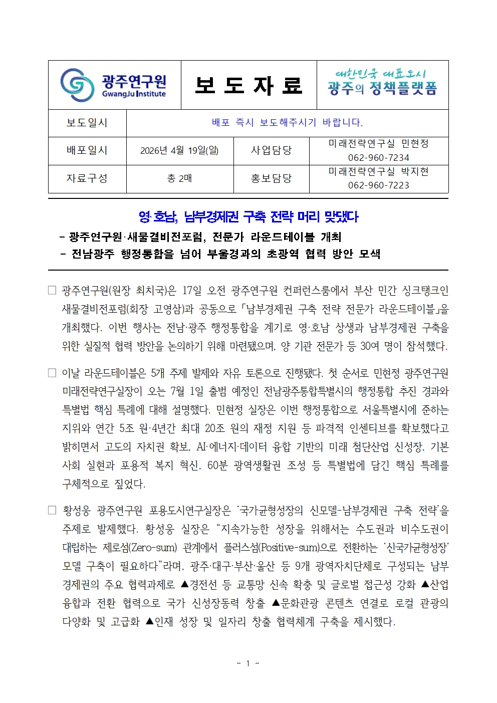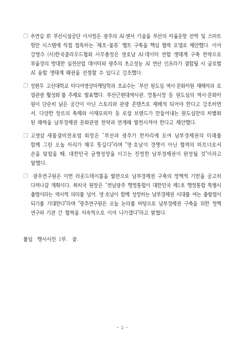 파일 #1 : [광주연구원 보도자료] 영·호남, 남부경제권 구축 전략 머리 맞댔다.hwp