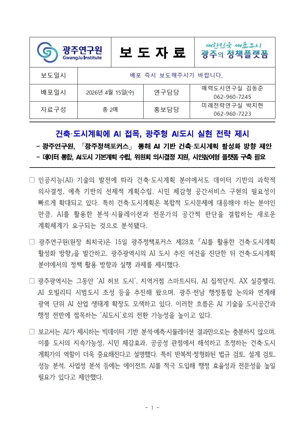 파일 #1 : [광주연구원 보도자료] 건축·도시계획에 AI 접목, 광주형 AI도시 실현 전략 제시.hwp