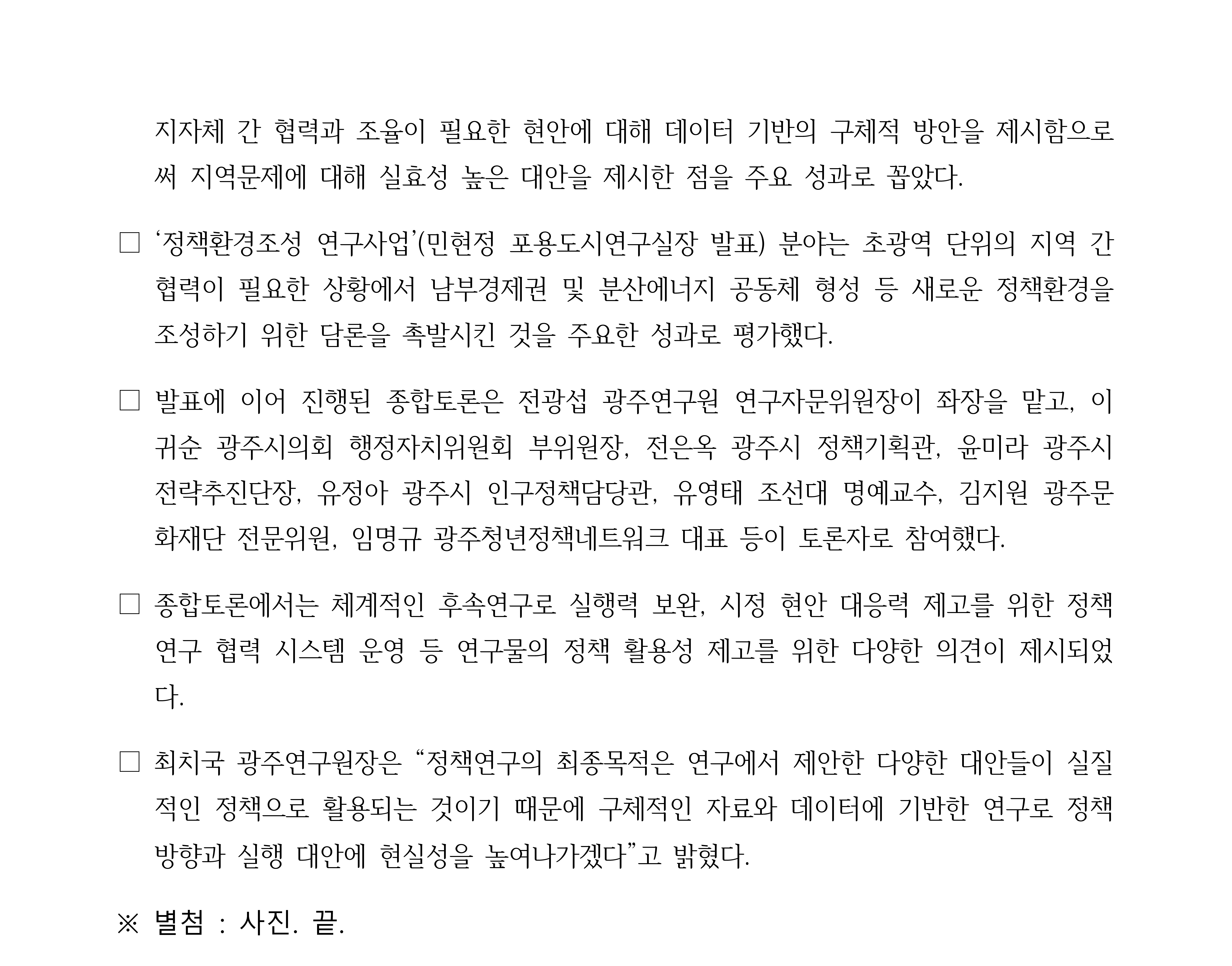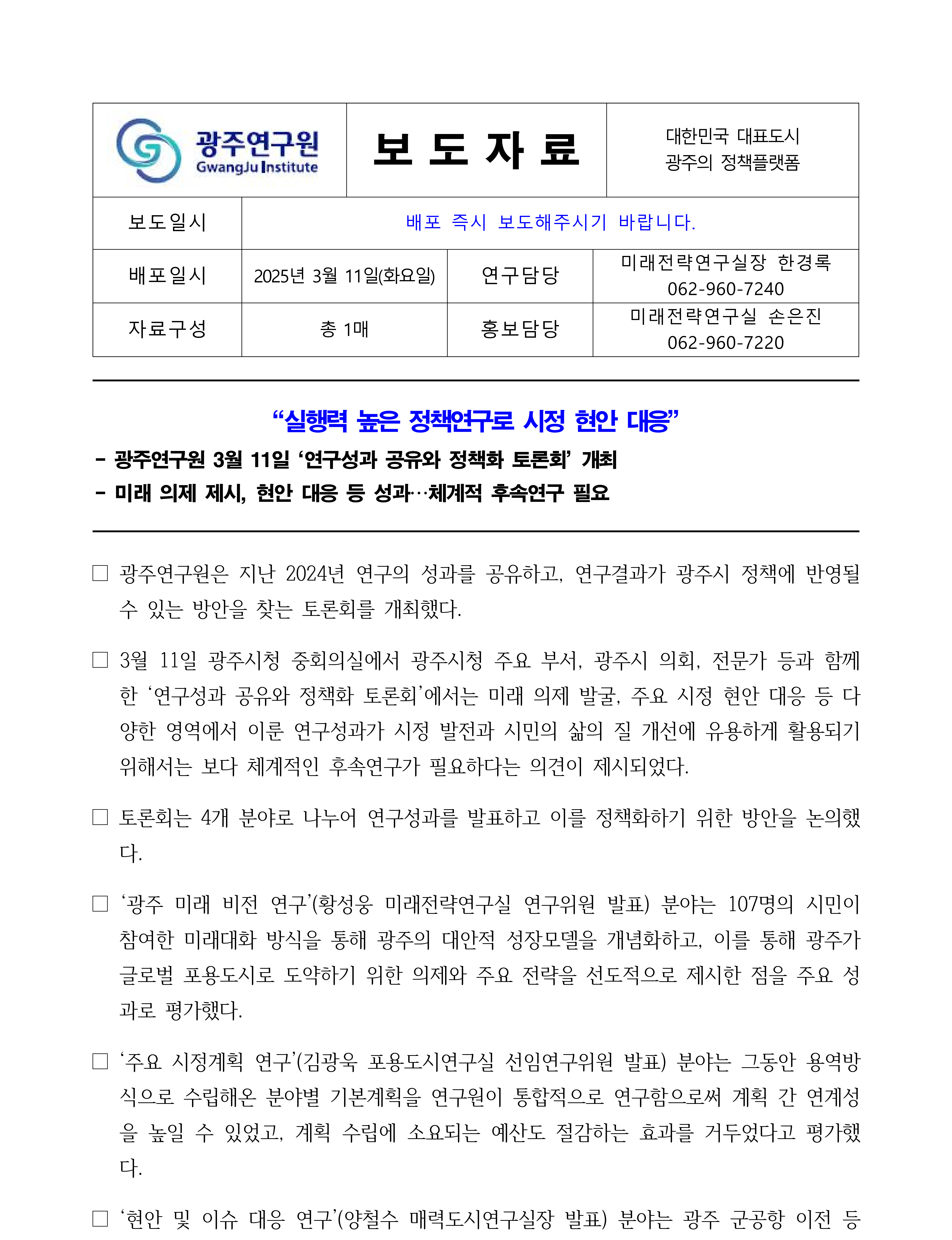 파일 #3 : [광주연구원 보도자료]실행력 높은 정책연구로 시정 현안 대응.pdf
