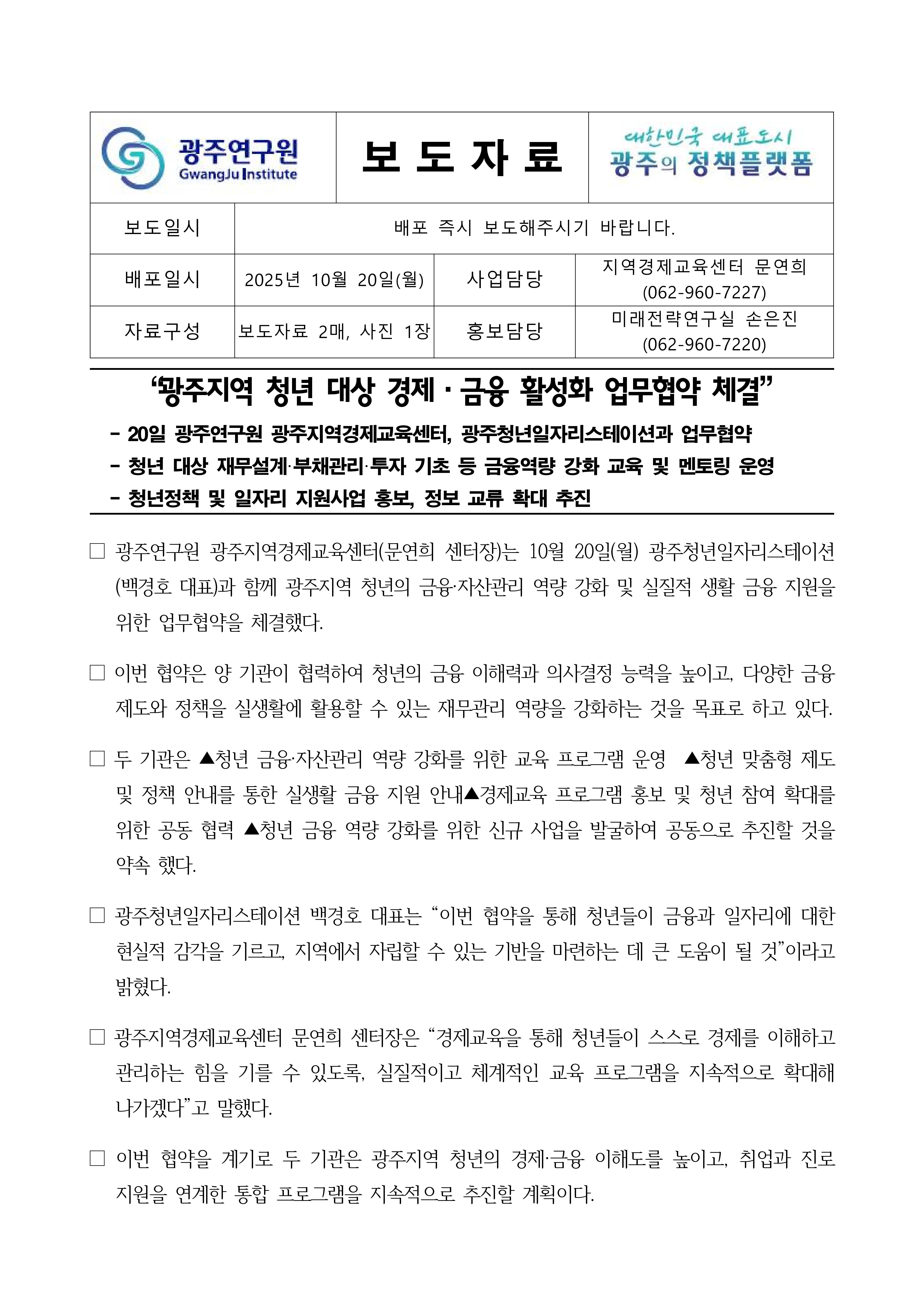 “광주지역 청년 대상 경제·금융 활성화 업무협약 체결”