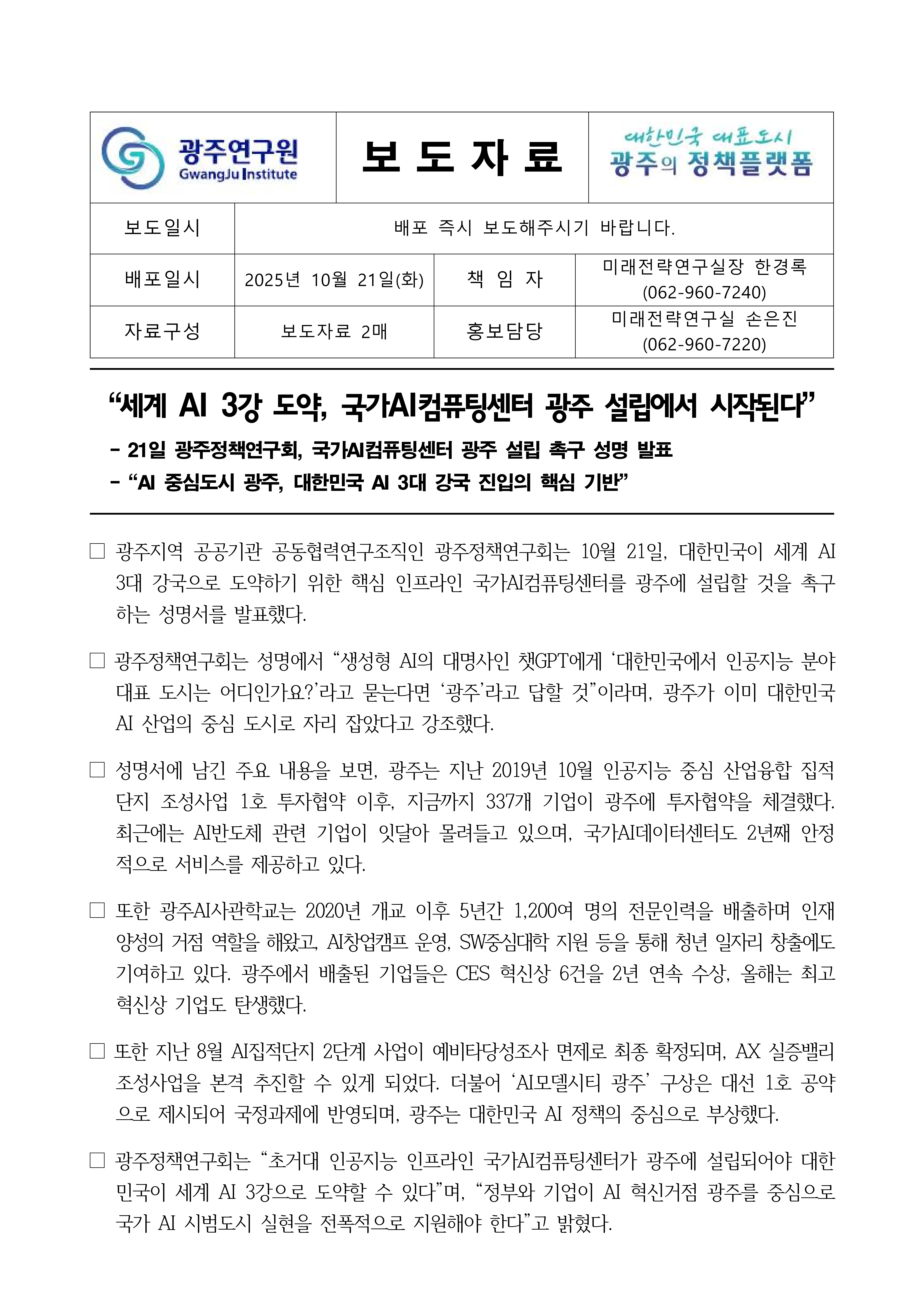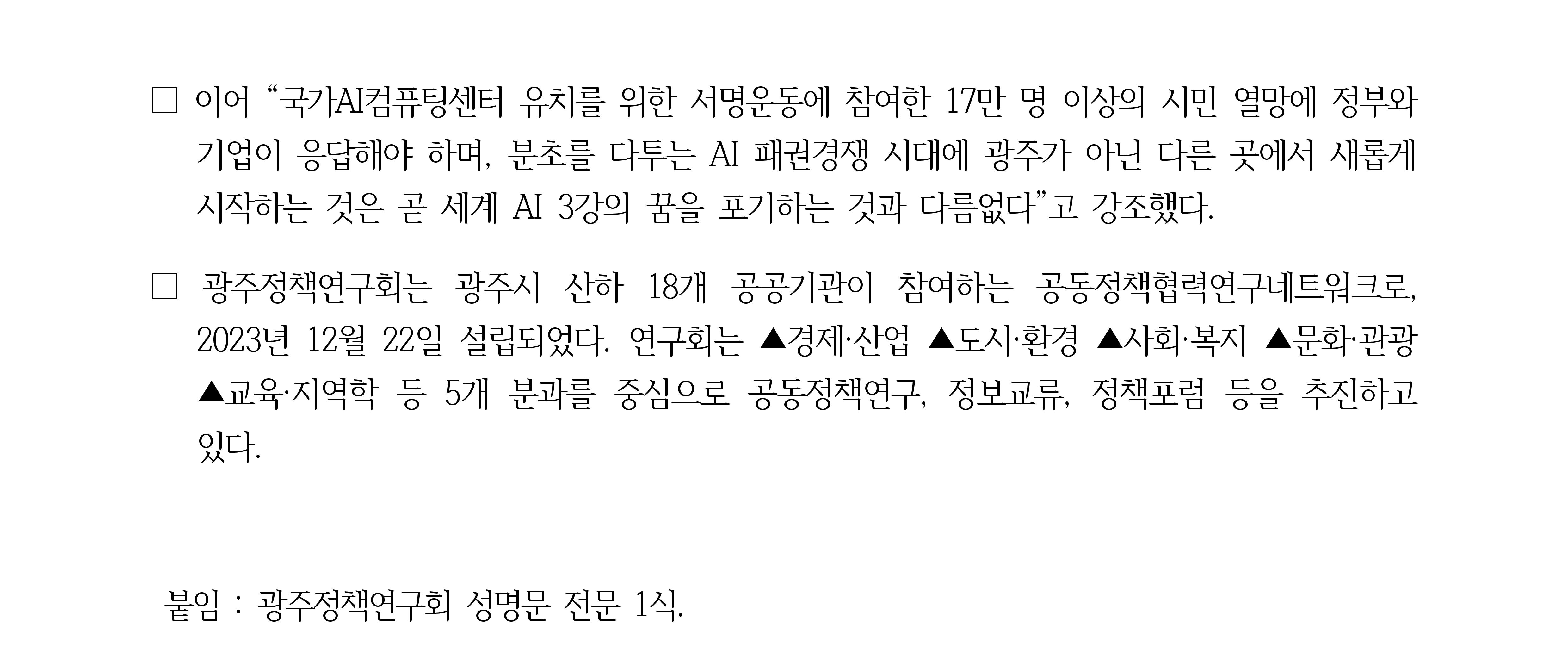 “세계 AI 3강 도약, 국가AI컴퓨팅센터 광주 설립에서 시작된다”