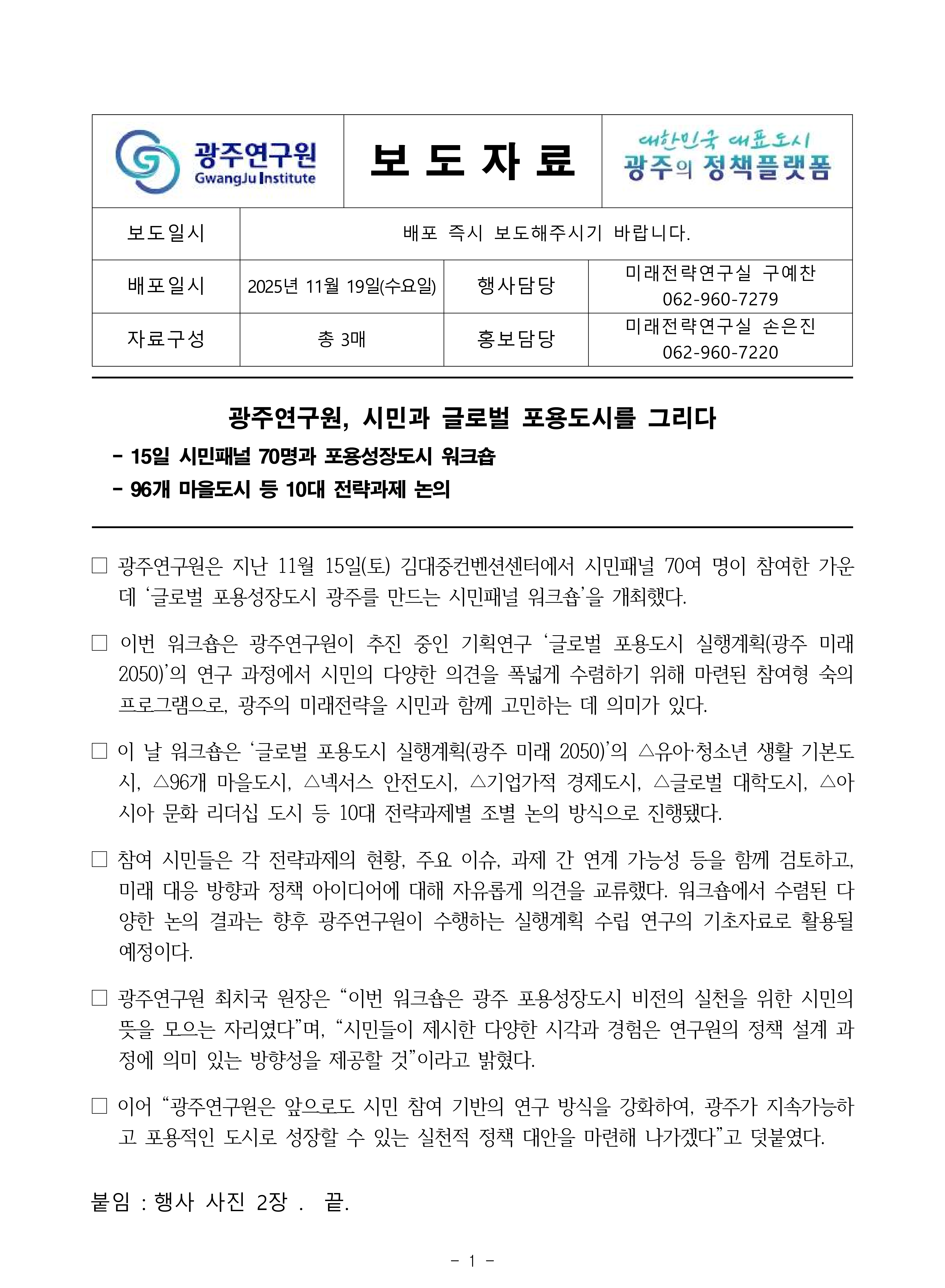 광주연구원, 시민과 글로벌 포용도시를 그리다