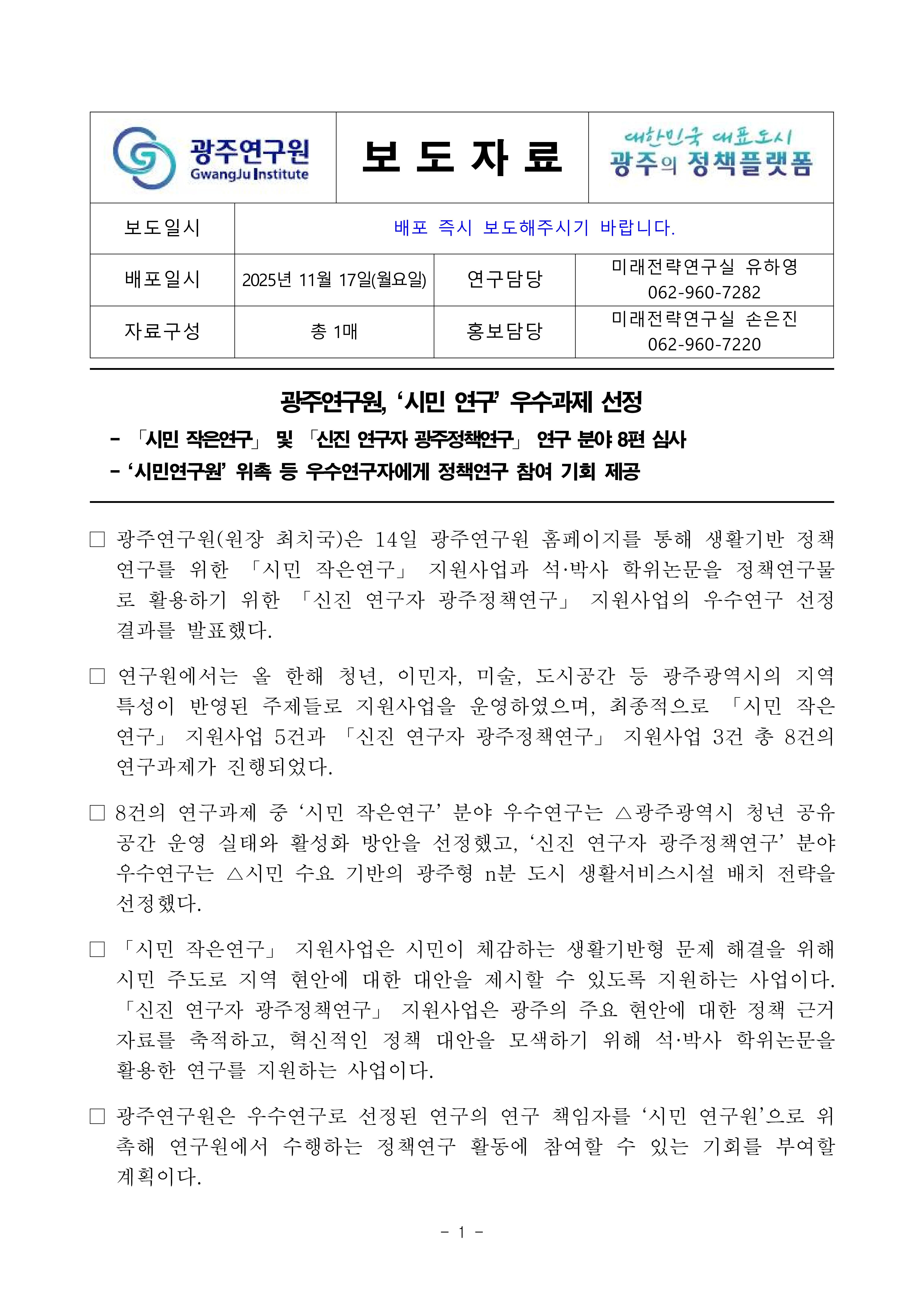 광주연구원, ‘시민 연구’ 우수과제 선정