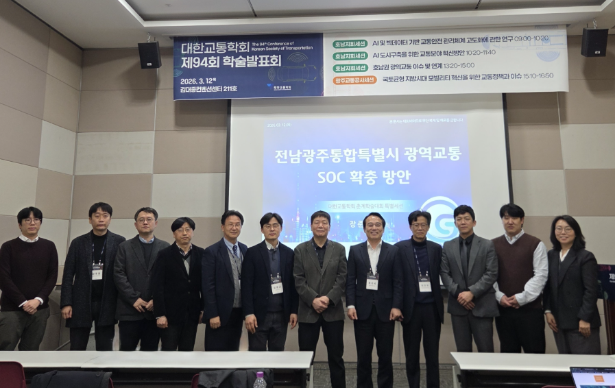 광주·전남·전북연구원은 3월 12일(목) 김대중컨벤션센터에서 호남이 직면한 교통 현안을 종합 진단하고 지역 교통체계의 공공성과 지속가능성을 높이기위한 2026 대한교통학회 학술대회 호남지회세션을 공동개최했다.