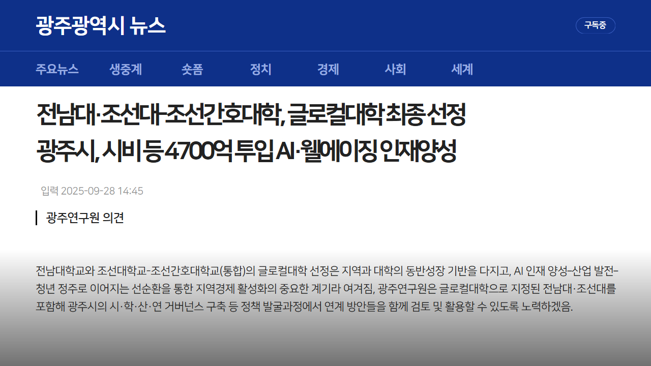 전남대·조선대-조선간호대학, 글로컬대학 최종 선정 광주시, 시비 등 4700억 투입 AI·웰에이징 인재양성