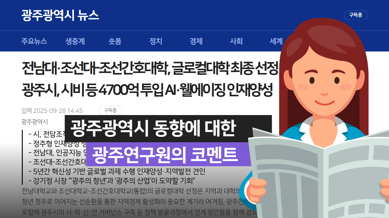 광주광역시의 주요 정책 및 산업 동향에 대한 보도자료와 언론보도 등을 중심으로, 이에 대한 광주연구원의 입장과 정책적 시사점을 제시합니다. 지역 현안에 대한 전문적 분석과 대응 방향을 공유함으로써, 지역 싱크탱크로서의 역할을 수행하고자 합니다.
