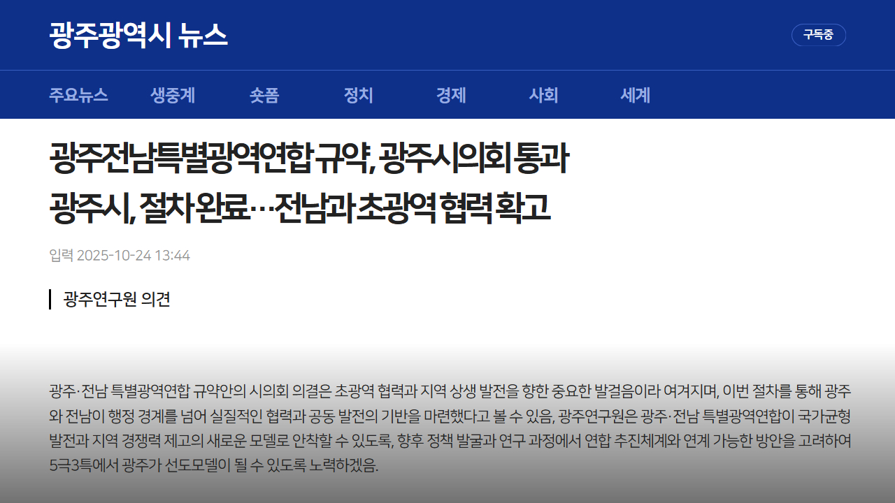 광주전남특별광역연합 규약, 광주시의회 통과 광주시, 절차 완료…전남과 초광역 협력 확고