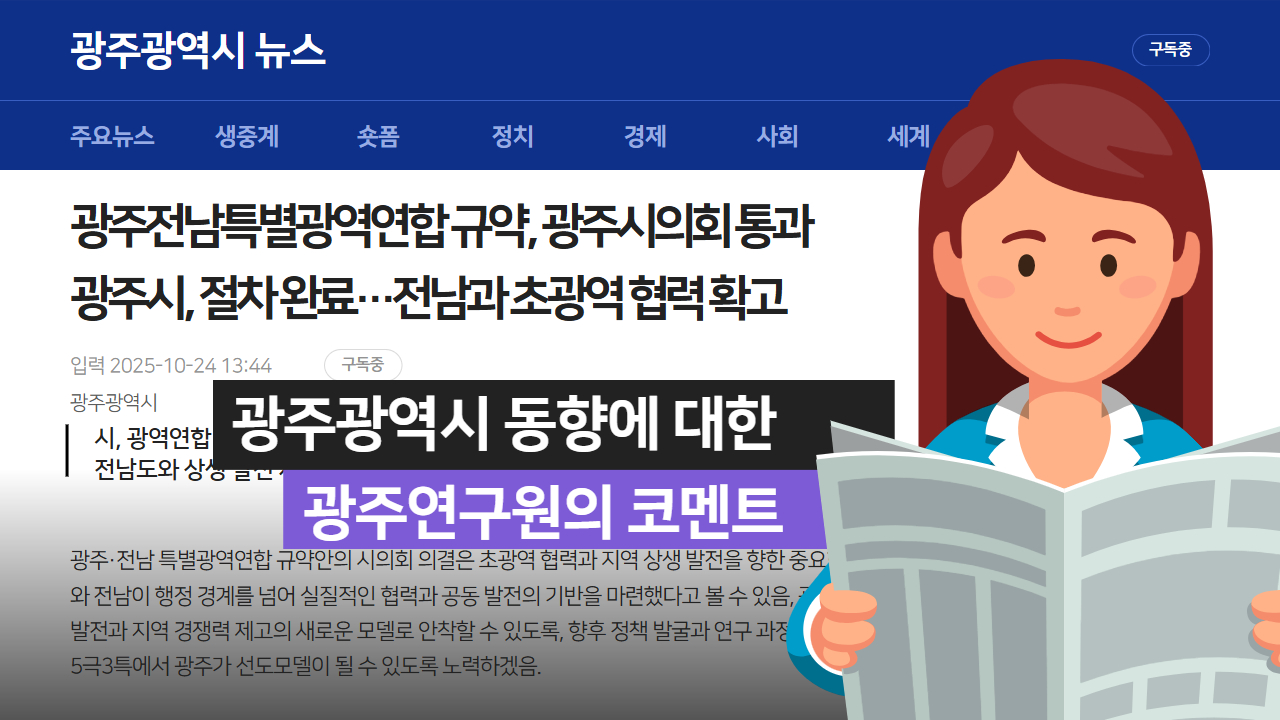 광주광역시의 주요 정책 및 산업 동향에 대한 보도자료와 언론보도 등을 중심으로, 이에 대한 광주연구원의 입장과 정책적 시사점을 제시합니다. 지역 현안에 대한 전문적 분석과 대응 방향을 공유함으로써, 지역 싱크탱크로서의 역할을 수행하고자 합니다.