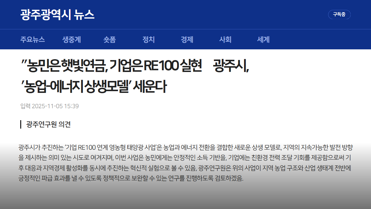 ″농민은 햇빛연금, 기업은 RE100 실현‶광주시, ′농업-에너지 상생모델′ 세운다