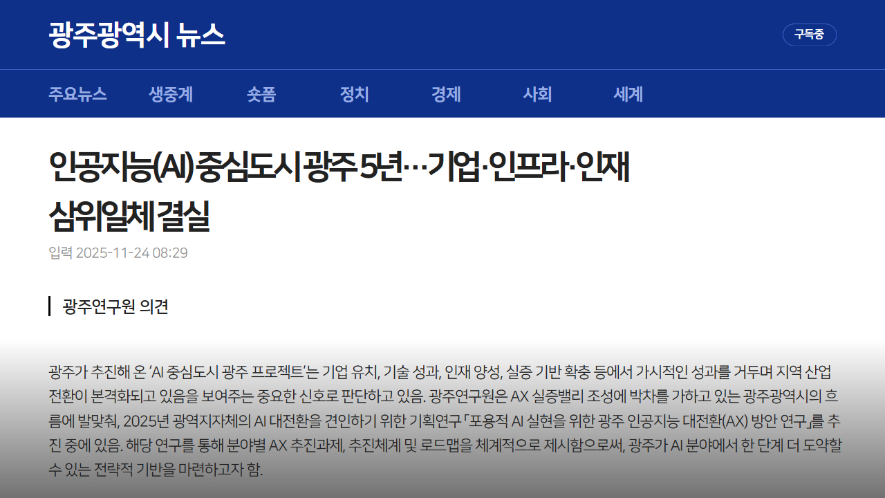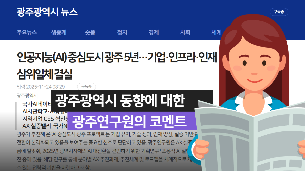 광주광역시의 주요 정책 및 산업 동향에 대한 보도자료와 언론보도 등을 중심으로, 이에 대한 광주연구원의 입장과 정책적 시사점을 제시합니다. 지역 현안에 대한 전문적 분석과 대응 방향을 공유함으로써, 지역 싱크탱크로서의 역할을 수행하고자 합니다.